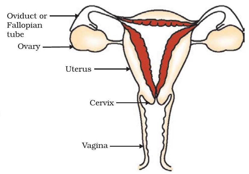 When a girl is born, the ovaries already contain thousands of immature eggs. On reaching puberty, some of these start maturing. One egg is produced every month by one of the ovaries. The egg is carried from the ovary to the womb through a thin oviduct or fallopian tube. The two oviducts unite into an elastic bag-like structure known as the uterus. The uterus opens into the vagina through the cervix.