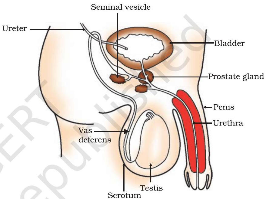 The sperms formed are delivered through the vas deferens which unites with a tube coming from the urinary bladder. The urethra thus forms a common passage for both the sperms and urine. Along the path of the vas deferens, glands like the prostate and the seminal vesicles add their secretions so that the sperms are now in a fluid which makes their transport easier and this fluid also provides nutrition. The sperms are tiny bodies that consist of mainly genetic material and a long tail that helps them to move towards the female germ-cell.