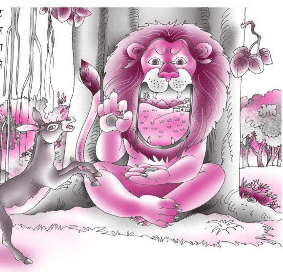 उसने कहा, “गधे, वह शेर का मुँह ज़रूर है, पर वहाँ है हरी घास का मैदान।” इतना कहकर वह शेर के मुँह के अंदर चला गया।