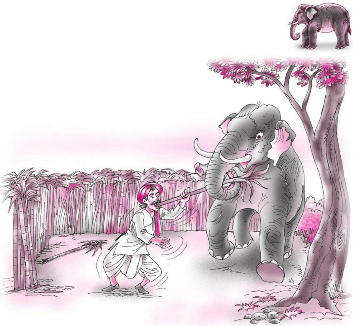 किसान के कुछ कहने से पहले ही हाथी ने बढ़कर अपनी सूँड से एक गन्ना तोड़ लिया और आदमी से कहा, “आओ खाएँ।”
