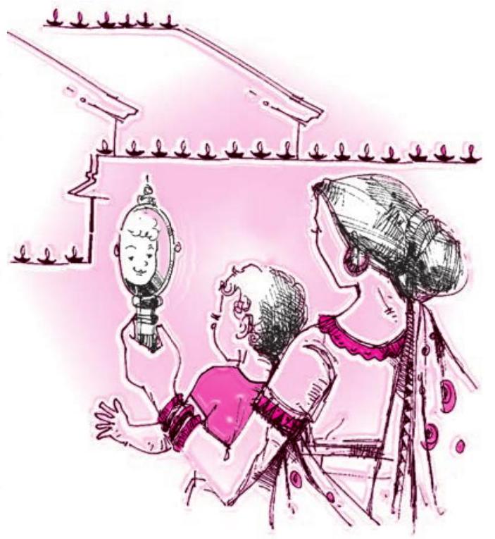 $\qquad$ दर्पण उसे दे के कह रही है माँ