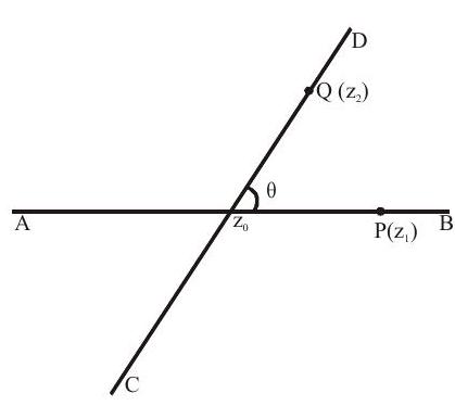 $1$ Let $\mathrm{AB} \& \mathrm{CD}$ intersect at $\mathrm{z} _{0}$. Let $\mathrm{P}\left(\mathrm{z} _{1}\right) \& \mathrm{Q}\left(\mathrm{z} _{2}\right)$ be two points on $A B \& C D$. Then the angle $\theta$ is given by $\theta=\arg \left(\frac{z _{2}-z _{0}}{z _{1}-z _{0}}\right)=\arg \left(z _{2}-z _{0}\right)-\arg \left(z _{1}-z _{0}\right)$