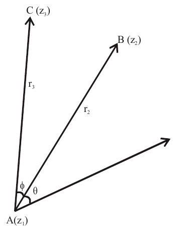 $\frac{\mathrm{z} _{3}-\mathrm{z} _{1}}{\mathrm{r} _{3}}=\frac{\mathrm{z} _{2}-\mathrm{z} _{1}}{\mathrm{r} _{2}} \mathrm{e}^{\mathrm{i} \varphi}$