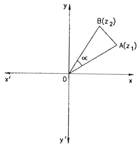 $ \begin{aligned} & \therefore \overrightarrow{\mathrm{OB}}=\overrightarrow{\mathrm{OA}} \mathrm{e}^{\mathrm{i} \alpha} \\ & \Rightarrow \mathrm{z} _{2}=\mathrm{z} _{1} \mathrm{e}^{\mathrm{i} \alpha} \\ & \Rightarrow \frac{z _{2}}{z _{1}}=\cos \alpha+i \sin \alpha \\ & \Rightarrow \frac{\mathrm{z} _{2}}{\mathrm{z} _{1}}+1=1+\cos \alpha+\mathrm{i} \sin \alpha \end{aligned} $
