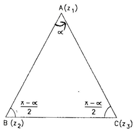 $ \begin{aligned} & \therefore \quad \overrightarrow{A C}=\overrightarrow{A B} e^{i \alpha} \\ & \Rightarrow \quad\left(z _{3}-z _{1}\right)=\left(z _{2}-z _{1}\right) e^{i \alpha} \\ & \Rightarrow \quad \frac{z _{3}-z _{1}}{z _{2}-z _{1}}=\cos \alpha+i \sin \alpha \\ & \Rightarrow \quad \frac{z _{3}-z _{1}}{z _{2}-z _{1}}-1=-1+\cos \alpha+i \sin \alpha \\ & \Rightarrow \quad \frac{z _{3}-z _{2}}{z _{2}-z _{1}}=-2 \sin ^{2} \frac{\alpha}{2}+2 i \sin \frac{\alpha}{2} \cos \frac{\alpha}{2} \\ & \Rightarrow \quad \frac{z _{3}-z _{2}}{z _{2}-z _{1}}=2 i \sin \frac{\alpha}{2}\left(\cos \frac{\alpha}{2}+i \sin \frac{\alpha}{2}\right) \\ & \Rightarrow \quad \frac{z _{3}-z _{2}}{z _{2}-z _{1}}=2 i \sin \frac{\alpha}{2} e^{i \alpha / 2} \\ & \Rightarrow \quad\left(\frac{z _{3}-z _{2}}{z _{2}-z _{1}}\right)^{2}=4 i^{2} \sin ^{2} \frac{\alpha}{2}\left(e^{i \alpha / 2}\right)^{2} \\ & \Rightarrow \quad\left(\frac{z _{3}-z _{2}}{z _{2}-z _{1}}\right)^{2}=-4 \sin ^{2} \frac{\alpha}{2} e^{i \alpha} \\ & \Rightarrow \quad\left(\frac{z _{3}-z _{2}}{z _{2}-z _{1}}\right)^{2}=-4 \sin ^{2} \frac{\alpha}{2}\left(\frac{z _{3}-z _{1}}{z _{2}-z _{1}}\right) \\ & \Rightarrow \quad\left(z _{3}-z _{2}\right)^{2}=4\left(z _{3}-z _{1}\right)\left(z _{1}-z _{2}\right) \sin ^{2} \frac{\alpha}{2} \end{aligned} $