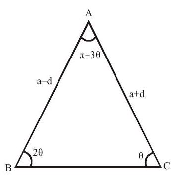 $\frac{\mathrm{a}-\mathrm{d}}{\sin \theta}=\frac{\mathrm{a}}{\sin (\pi-3 \theta)}=\frac{\mathrm{a}+\mathrm{d}}{\sin 2 \theta}$