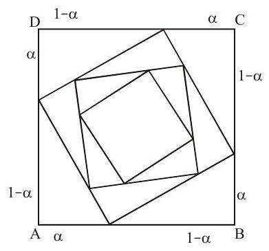 Let $A B C D$ be a unit square and $0<\alpha<1$. Each side of the square is divided in the ratio $\alpha: 1-\alpha$, as shown in the figure. These points are connected to obtain another square. The sides of new square are divided in the ratio $\alpha: 1-\alpha$ and points are joined to obtain another square. The process is continued indefinitely.