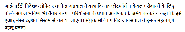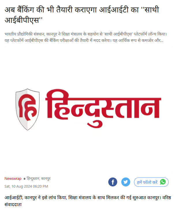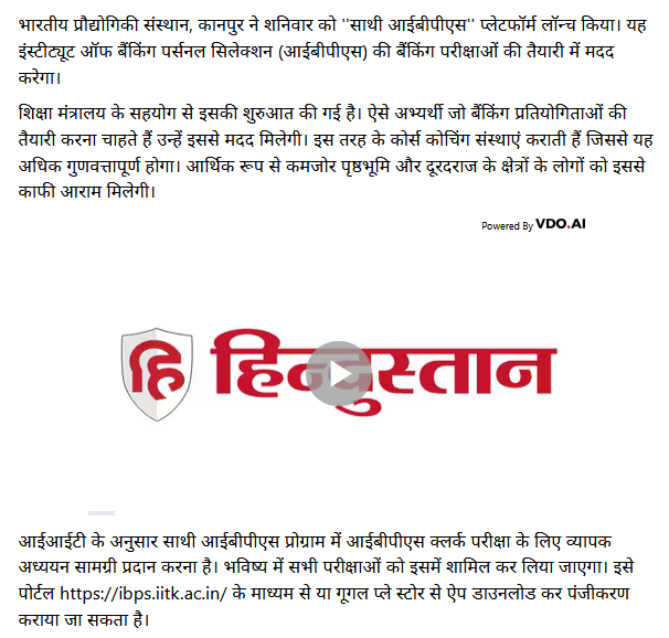 अब बैंकिंग की भी तैयारी कराएगा आईआईटी का ‘‘साथी आईबीपीएस’’ भारतीय प्रौद्योगिकी संस्थान, कानपुर ने शिक्षा मंत्रालय के सहयोग से ‘साथी आईबीपीएस’ प्लेटफॉर्म लॉन्च किया। यह प्लेटफॉर्म आईबीपीएस की बैंकिंग परीक्षाओं की तैयारी में मदद करेगा। यह आर्थिक रूप से कमजोर और… आईआईटी, कानपुर ने इसे लांच किया, शिक्षा मंत्रालय के साथ मिलकर की गई शुरुआत कानपुर। वरिष्ठ संवाददाता भारतीय प्रौद्योगिकी संस्थान, कानपुर ने शनिवार को ‘‘साथी आईबीपीएस’’ प्लेटफॉर्म लॉन्च किया। यह इंस्टीट्यूट ऑफ बैंकिंग पर्सनल सिलेक्शन (आईबीपीएस) की बैंकिंग परीक्षाओं की तैयारी में मदद करेगा। शिक्षा मंत्रालय के सहयोग से इसकी शुरुआत की गई है। ऐसे अभ्यर्थी जो बैंकिंग प्रतियोगिताओं की तैयारी करना चाहते हैं उन्हें इससे मदद मिलेगी। इस तरह के कोर्स कोचिंग संस्थाएं कराती हैं जिससे यह अधिक गुणवत्तापूर्ण होगा। आर्थिक रूप से कमजोर पृष्ठभूमि और दूरदराज के क्षेत्रों के लोगों को इससे काफी आराम मिलेगी। आईआईटी के अनुसार साथी आईबीपीएस प्रोग्राम में आईबीपीएस क्लर्क परीक्षा के लिए व्यापक अध्ययन सामग्री प्रदान करना है। भविष्य में सभी परीक्षाओं को इसमें शामिल कर लिया जाएगा। इसे पोर्टल https://ibps.iitk.ac.in/ के माध्यम से या गूगल प्ले स्टोर से ऐप डाउनलोड कर पंजीकरण कराया जा सकता है। आईआईटी निदेशक प्रोफेसर मणीन्द्र अग्रवाल ने कहा कि यह प्लेटफॉर्म न केवल परीक्षाओं के लिए बल्कि सफल भविष्य भी तैयार करेगा। परियोजना के प्रधान अन्वेषक प्रो. अमेय करकरे ने कहा कि इसे एआई बेस्ड ट्यूशन सिस्टम से चलाया जाएगा। संयुक्त सचिव गोविंद जायसवाल ने इसके महत्वपूर्ण पहलू बताए।