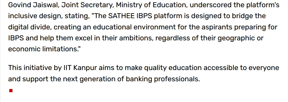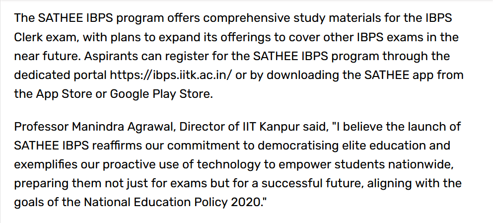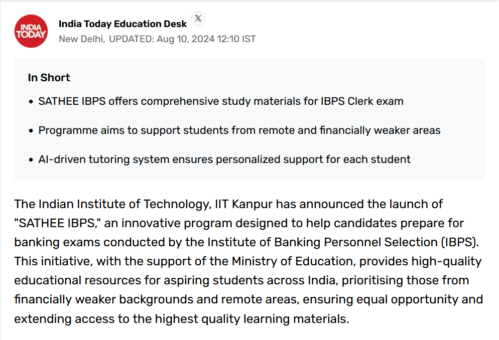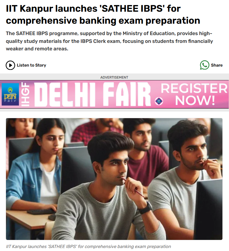 IIT Kanpur launches ‘SATHEE IBPS’ for comprehensive banking exam preparation The SATHEE IBPS programme, supported by the Ministry of Education, provides high-quality study materials for the IBPS Clerk exam, focusing on students from financially weaker and remote areas. In Short