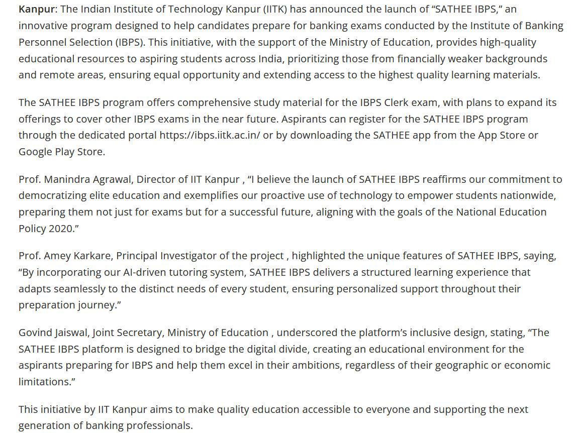 Kanpur: The Indian Institute of Technology Kanpur (IITK) has announced the launch of “SATHEE IBPS,” an innovative program designed to help candidates prepare for banking exams conducted by the Institute of Banking Personnel Selection (IBPS). This initiative, with the support of the Ministry of Education, provides high-quality educational resources to aspiring students across India, prioritizing those from financially weaker backgrounds and remote areas, ensuring equal opportunity and extending access to the highest quality learning materials.