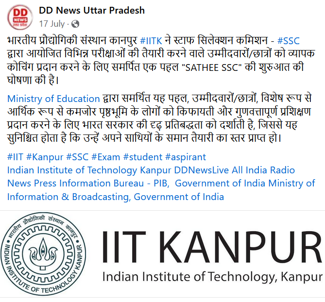 भारतीय प्रौद्योगिकी संस्थान कानपुर #IITK ने स्टाफ सिलेक्शन कमिशन - #SSC द्वारा आयोजित विभिन्न परीक्षाओं की तैयारी करने वाले उम्मीदवारों/छात्रों को व्यापक कोचिंग प्रदान करने के लिए समर्पित एक पहल “SATHEE SSC” की शुरुआत की घोषणा की है।