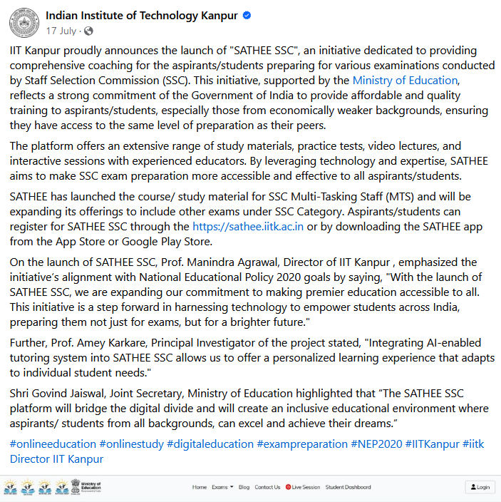 IIT Kanpur proudly announces the launch of “SATHEE SSC”, an initiative dedicated to providing comprehensive coaching for the aspirants/students preparing for various examinations conducted by Staff Selection Commission (SSC). This initiative, supported by the Ministry of Education, reflects a strong commitment of the Government of India to provide affordable and quality training to aspirants/students, especially those from economically weaker backgrounds, ensuring they have access to the same level of preparation as their peers. The platform offers an extensive range of study materials, practice tests, video lectures, and interactive sessions with experienced educators. By leveraging technology and expertise, SATHEE aims to make SSC exam preparation more accessible and effective to all aspirants/students. SATHEE has launched the course/ study material for SSC Multi-Tasking Staff (MTS) and will be expanding its offerings to include other exams under SSC Category. Aspirants/students can register for SATHEE SSC through the https://sathee.iitk.ac.in or by downloading the SATHEE app from the App Store or Google Play Store. On the launch of SATHEE SSC, Prof. Manindra Agrawal, Director of IIT Kanpur , emphasized the initiative’s alignment with National Educational Policy 2020 goals by saying, “With the launch of SATHEE SSC, we are expanding our commitment to making premier education accessible to all. This initiative is a step forward in harnessing technology to empower students across India, preparing them not just for exams, but for a brighter future.” Further, Prof. Amey Karkare, Principal Investigator of the project stated, “Integrating AI-enabled tutoring system into SATHEE SSC allows us to offer a personalized learning experience that adapts to individual student needs.” Shri Govind Jaiswal, Joint Secretary, Ministry of Education highlighted that “The SATHEE SSC platform will bridge the digital divide and will create an inclusive educational environment where aspirants/ students from all backgrounds, can excel and achieve their dreams.” #onlineeducation #onlinestudy #digitaleducation #exampreparation #NEP2020 #IITKanpur #iitk Director IIT Kanpur