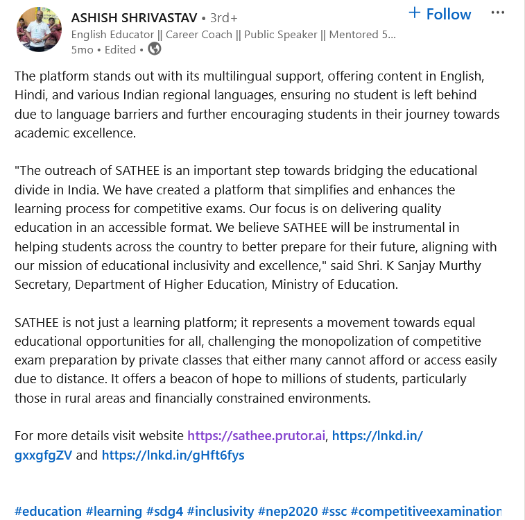 “The outreach of SATHEE is an important step towards bridging the educational divide in India. We have created a platform that simplifies and enhances the learning process for competitive exams. Our focus is on delivering quality education in an accessible format. We believe SATHEE will be instrumental in helping students across the country to better prepare for their future, aligning with our mission of educational inclusivity and excellence,” said Shri. K Sanjay Murthy Secretary, Department of Higher Education, Ministry of Education.