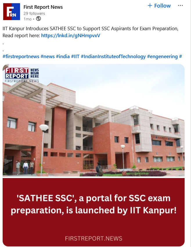 IIT Kanpur Introduces SATHEE SSC to Support SSC Aspirants for Exam Preparation, Read report here: https://lnkd.in/gNHmpvxV . . #firstreportnews #news #india #IIT #IndianInstituteofTechnology #engeneering #iitkanpur