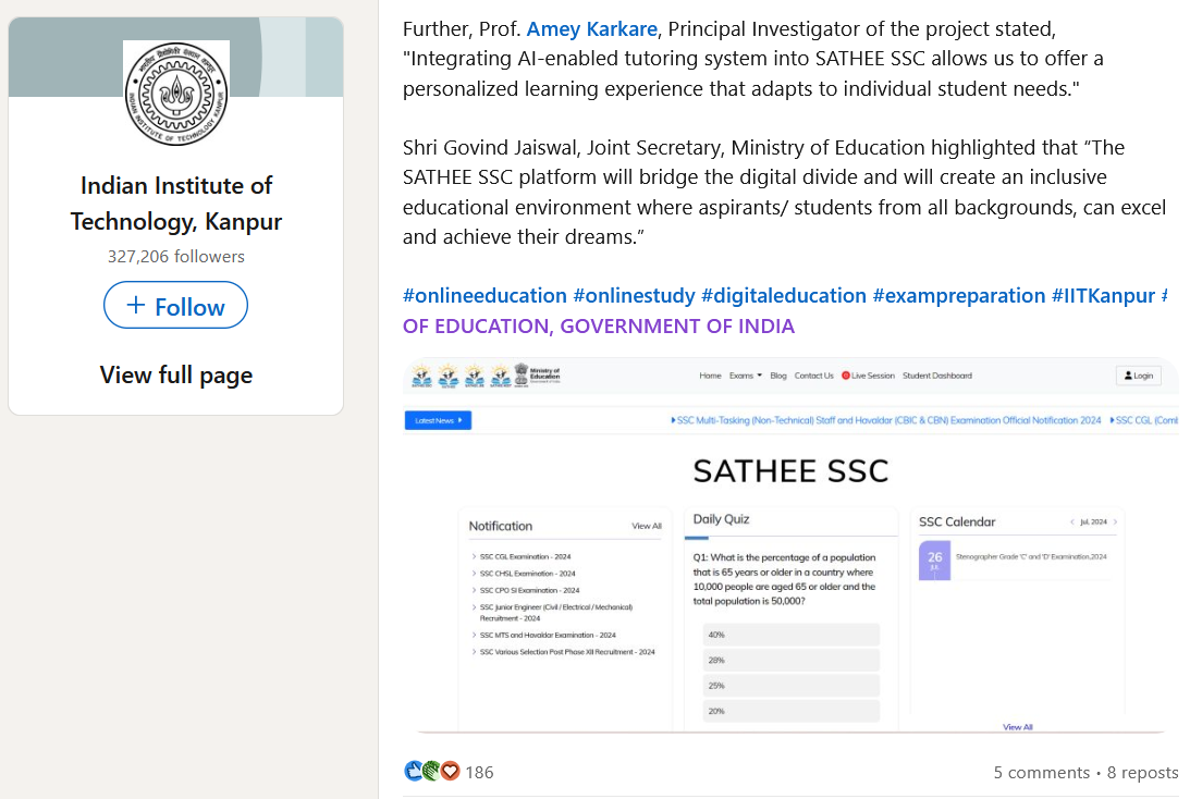 Further, Prof. Amey Karkare, Principal Investigator of the project stated, “Integrating AI-enabled tutoring system into SATHEE SSC allows us to offer a personalized learning experience that adapts to individual student needs.”