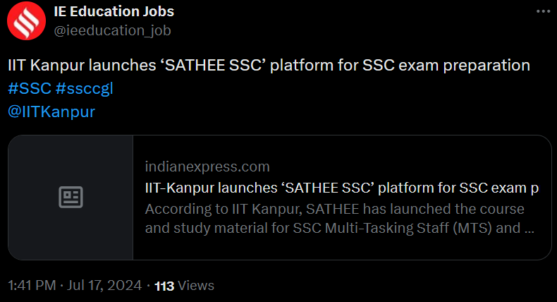 IIT Kanpur launches ‘SATHEE SSC’ platform for SSC exam preparation #SSC #ssccgl @IITKanpur indianexpress.com IIT-Kanpur launches ‘SATHEE SSC’ platform for SSC exam preparation According to IIT Kanpur, SATHEE has launched the course and study material for SSC Multi-Tasking Staff (MTS)
