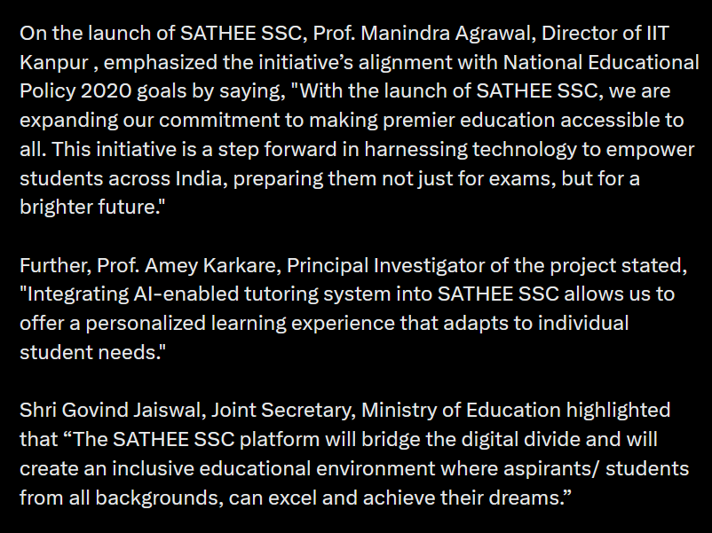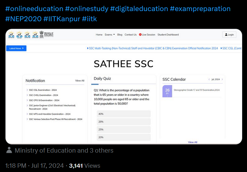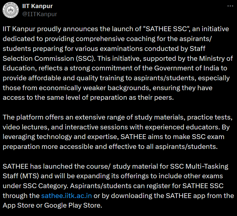 On the launch of SATHEE SSC, Prof. Manindra Agrawal, Director of IIT Kanpur , emphasized the initiative’s alignment with National Educational Policy 2020 goals by saying, “With the launch of SATHEE SSC, we are expanding our commitment to making premier education accessible to all. This initiative is a step forward in harnessing technology to empower students across India, preparing them not just for exams, but for a brighter future.”