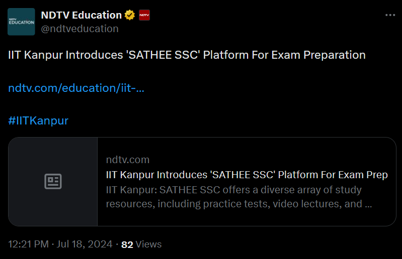 #IITKanpur ndtv.com IIT Kanpur Introduces ‘SATHEE SSC’ Platform For Exam Preparation IIT Kanpur: SATHEE SSC offers a diverse array of study resources, including practice tests, video lectures
