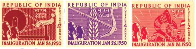 இந்த மூன்று ஸ்டேப் 1950 ஆம் ஆண்டு முதல் குடியரசுத் திருநாளான 26 ஜனவரி 1950 ஆம் நாளைக் குறிக்க வெளியிடப்பட்டன. இந்த ஸ்டேப்பின் படங்கள் புதிய குடியரசுக்கு எத்தனை சவால்கள் இருந்தன என்பதை உங்களுக்கு என்ன கூறுகிறது? 1950 ஆம் ஆண்டில் இந்த ஸ்டேப்பை வடிவமைக்க கேட்கப்பட்டிருந்தால், நீங்கள் என்ன படங்களை தேர்வு செய்திருப்பீர்கள்?
